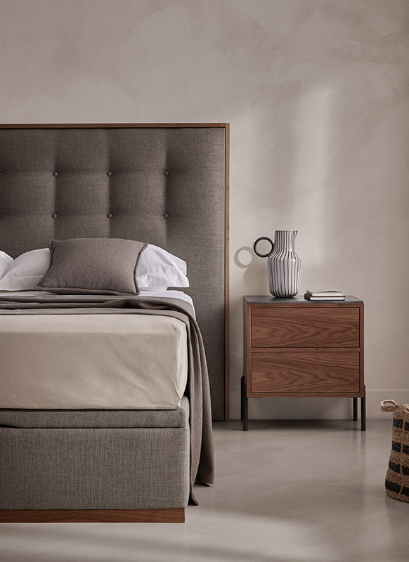 Stay conserve la valeur de l’artisanat, grâce à ses boutons rembourrés à la main dans le tissu sélectionné, qui, avec le cadre en bois naturel, en chêne ou en noyer, créent une composition élégante et distinguée. Le travail capitonné de grand volume transmet la sensation agréable et le confort de la tête de lit.